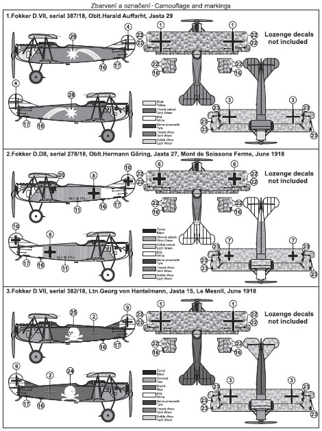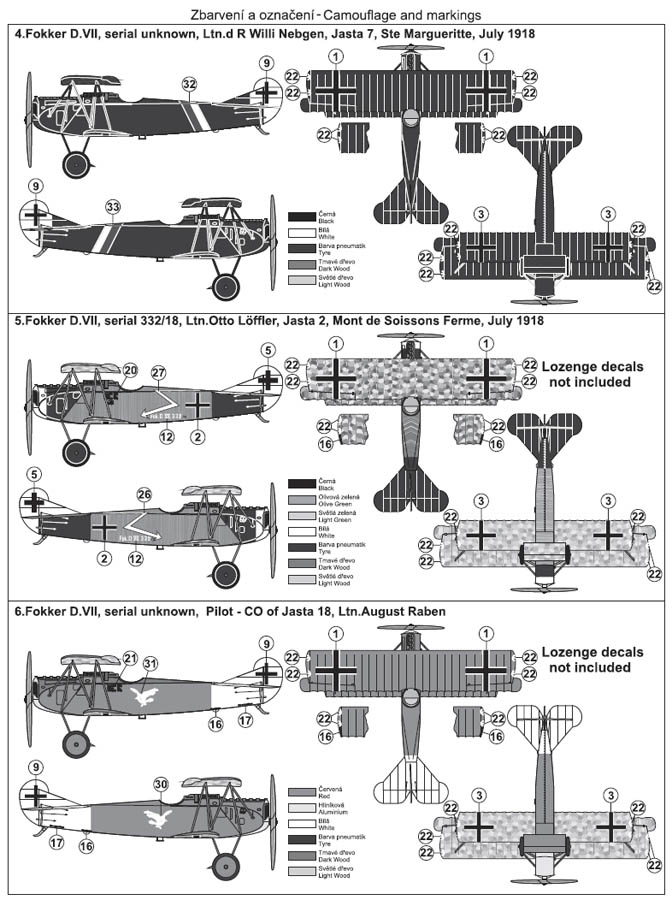zakryto. Je třeba brát v úvahu fakt, že zbarvení Fokkerů D.VII je všeobecně značně